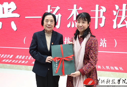 在现场人员热烈的掌声中,杨杰向我校捐赠书法作品和《杨杰作品集》,胡大白董事长接受捐赠并向杨杰颁发收藏证书。