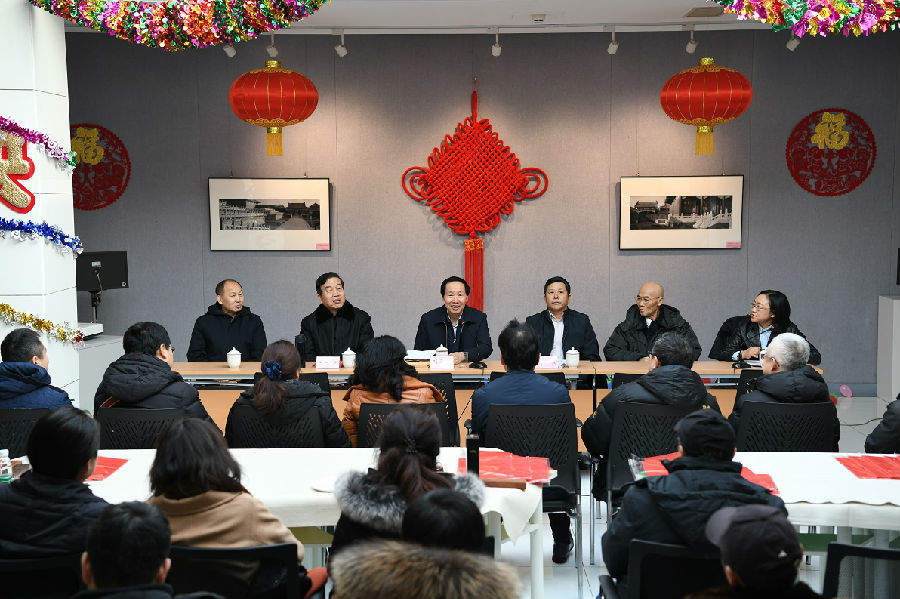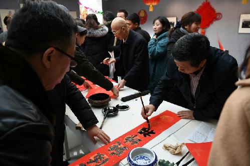 成立大会后,苏士澍、胡冰、中国书画收藏家协会原会长闫振堂等现场创作春联、福字,为干部职工 “送福送春联”。记者在现场看到,为了拿到“福”字,大家排起长队,都希望将“福”带回家。